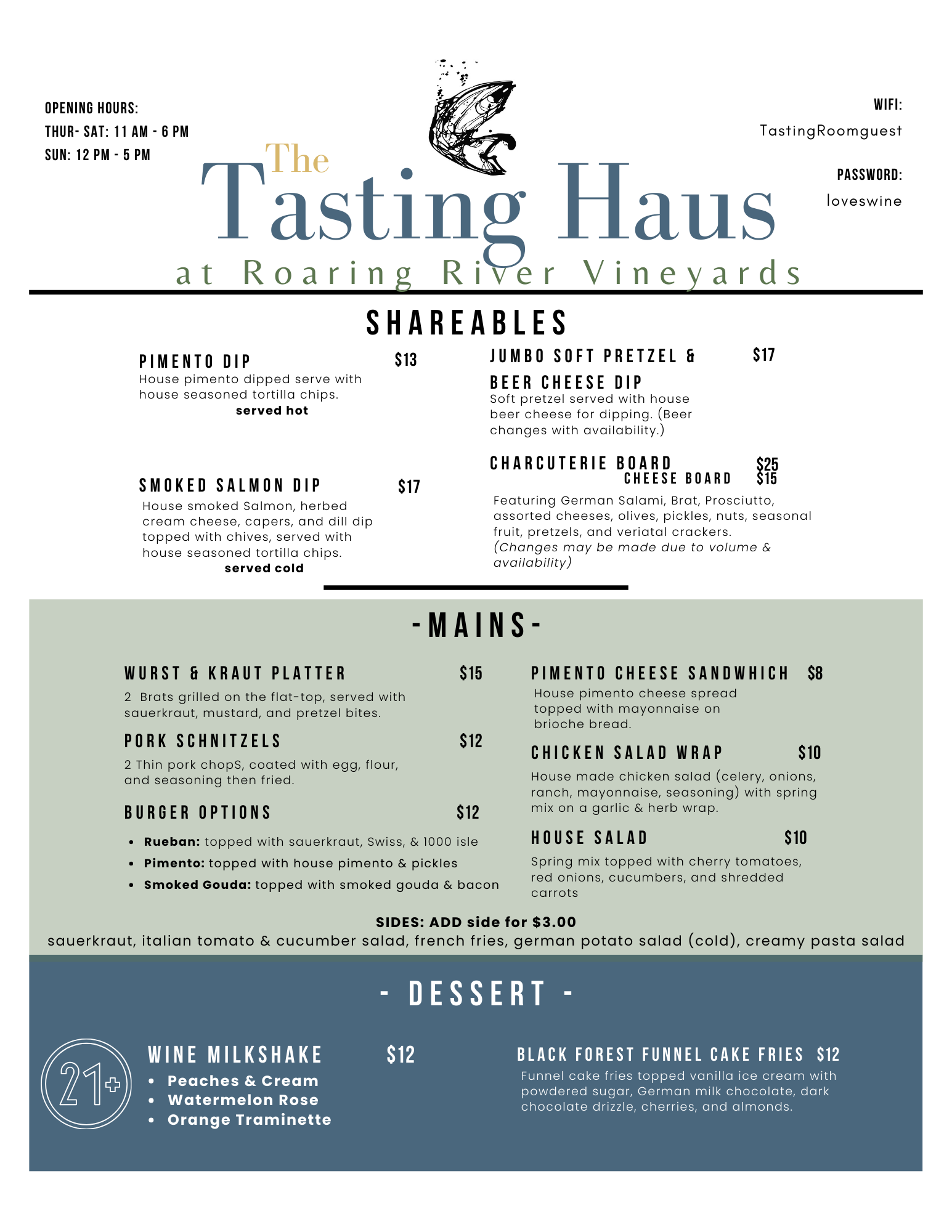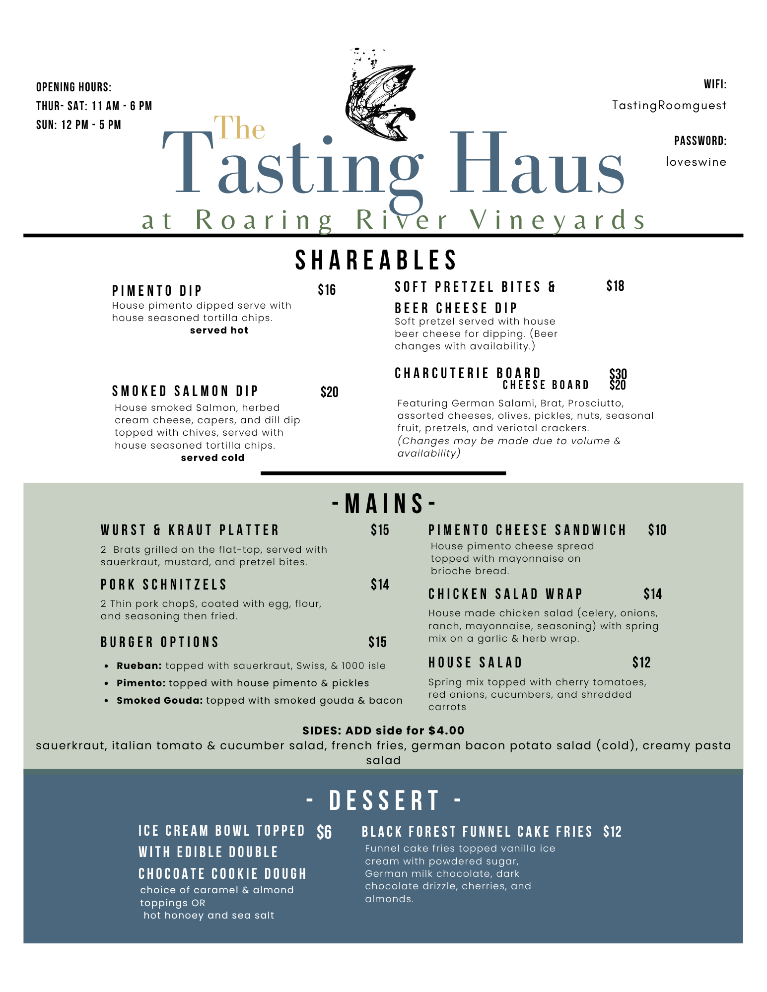 Feeling hungry? Try something from our German-inspired food menu. From flavorful shareables to cozy comfort food, everything is made with fresh, local ingredients and designed to pair perfectly with your experience!